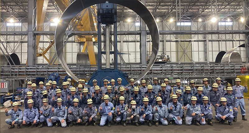 JFEエンジニアリング株式会社笠岡モノパイル製作所では、洋上風力発電の風車タワーを支える巨大な鋼鉄製のパイプ=モノパイルを製作しています。JFEウエストテクノロジー株式会社モノパイル製造部は、極厚鋼板を専用装置でつなぎ合わせ溶接を行う「板継ぎ」工程と、ベンディングローラーと呼ばれる装置で鋼板をパイプ状に巻き上げる「鋼板曲げ」の工程を担当しています。